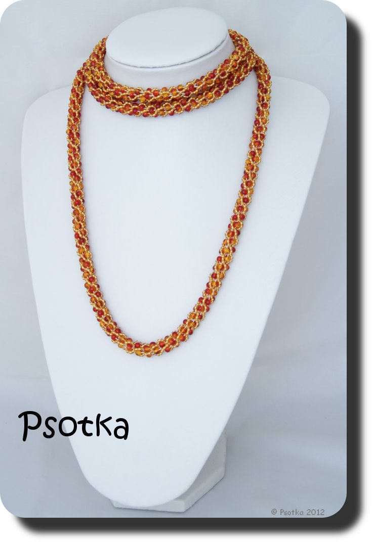 Naszyjnik ten powstał stosunkowo szybko. Więcej czasu zajęło mi nawlekanie koralików niż szydełkowanie 😀 a zaczęło się od tego, że przy zamawianiu koralików wpadły mi w oko koraliki cracle 4mm w czerwono-żółtym kolorze 🙂