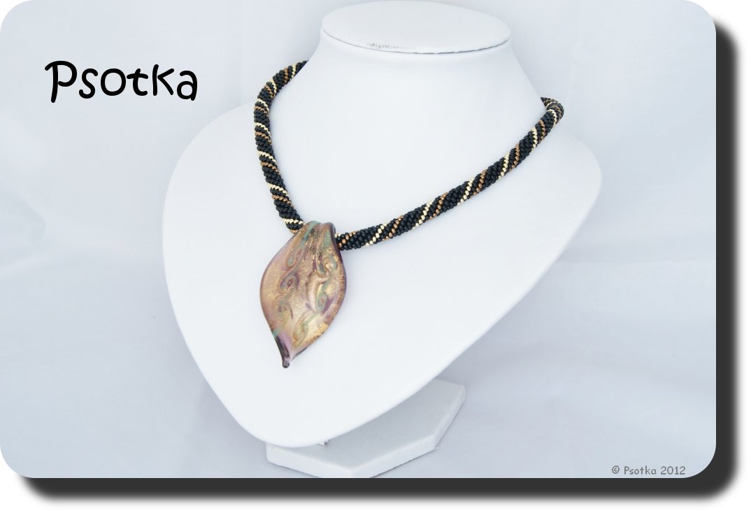 Poza tym mamcia nawlekła mi koraliki na kolejny sznur i tak powstał elegancki naszyjnik z wisiorem ze szkła weneckiego. Koraliczki TOHO Round 11o nawleczone są w sekwencji 3a1b1a1c, gdzie a – Opaque Jet, b – Permanent Finish – Galvanized Starlight, c – Bronze.