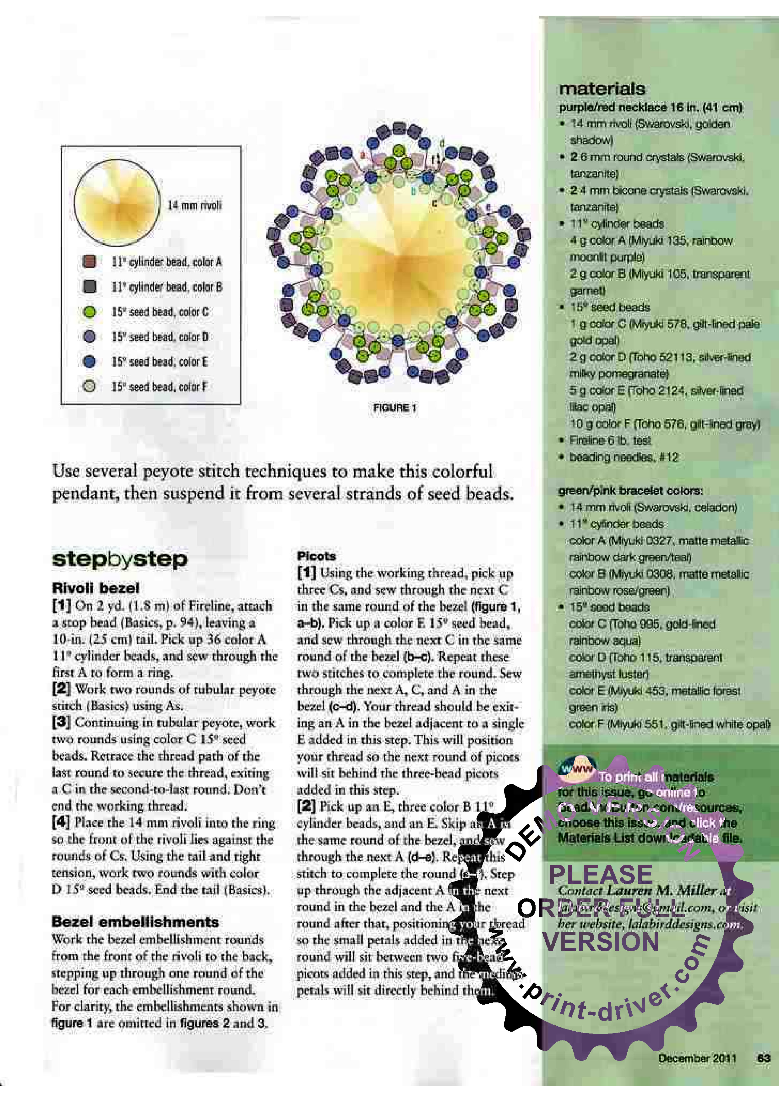 W następnym kroku powstało zapięcie łączące z sobą sznury. A po nim zabrałam się za najtrudniejszą część, czyli wydziubanie pięciu kwiatów zgodnie ze schematem zamieszczonym w Bead&Button December 2011r. (schemat 1, 2, 3, 4). Wykorzystałam koraliki TOHO Treasure 12o Silver-Lined Crystal i Frosted Crystal, TOHO Round 11o Silver-Lined Frosted Black Diamond, TOHO Round 15o Silver-Lined Gray i Frosted Crystal. W środku mamy kryształek Swarovski’ego – Rivoli Crystal 14mm 🙂 Zrobienie tego zajęło mi prawie dwa tygodnie, a moje oczka dochodziły do siebie przez tydzień.