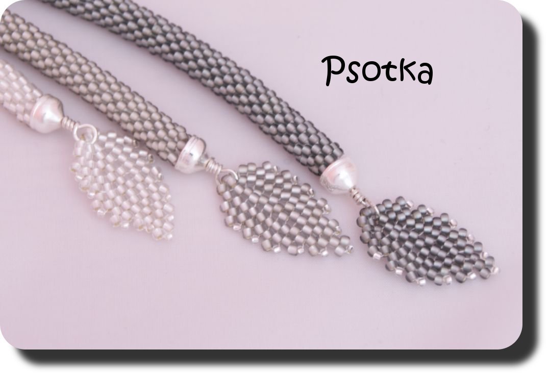Na koniec powstały listki, których schemat można znaleźć na kilku stronach, oto jedna z nich: klik. Każdy w kolorze sznura, na którym jest zawieszony z dodatkiem koraliczków TOHO Round 150 Silver-Lined Crystal.
