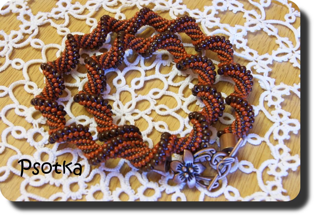 Przy czarnej z TOHO 11/0 Opaque Jet i TOHO 15/0 Opaque-Frosted Jet było sporo zabawy, bo to żyłkę sobie ciut za krótką wzięłam, a to koraliki nie chciały się układać jak trzeba, co chwilę coś, ale w końcu udało się 🙂