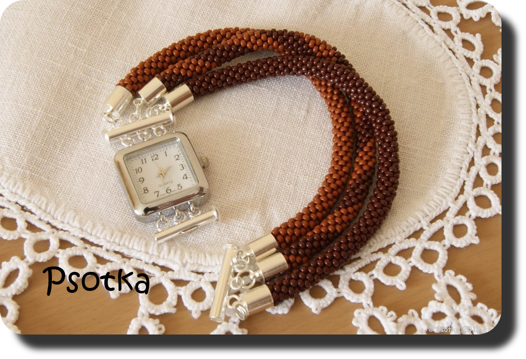 Ostatnio dla mojej kochanej mamci powstały dwie bransoletki do zegarka, ponieważ za zwykłymi bransoletkami ona nie przepada, a tak to są one uzupełnieniami do naszyjników 🙂