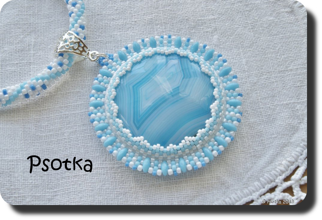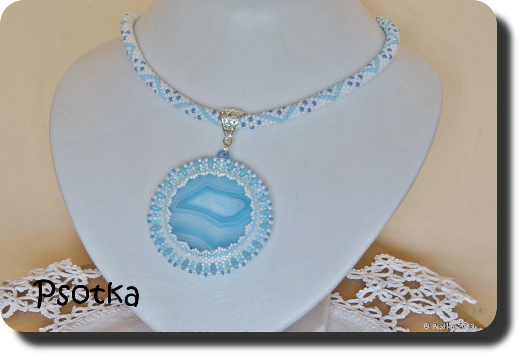 Każda ze stron agatu jest inna, więc oprawiając go wykorzystałam to i stworzyłam dwustronny medalion. Do oplecenia wykorzystałam koraliki TOHO w kolorach Opaque-Lustered White, Opaque Blue Turquoise i Cornflower oraz SuperDuo Blue Turquoise.