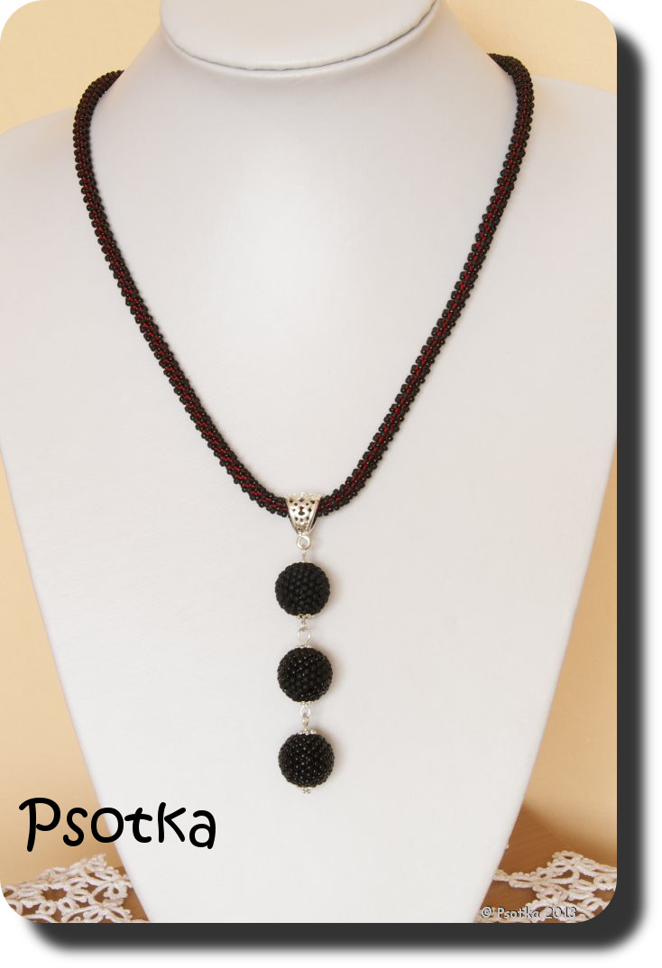 Pierwszy ze sznurów ma długość 100cm i zawiesiłam na nim trzy beaded balls, czyli kulki koralikowe ściegiem peyote. Całość wykończona została elementami posrebrzanymi.
