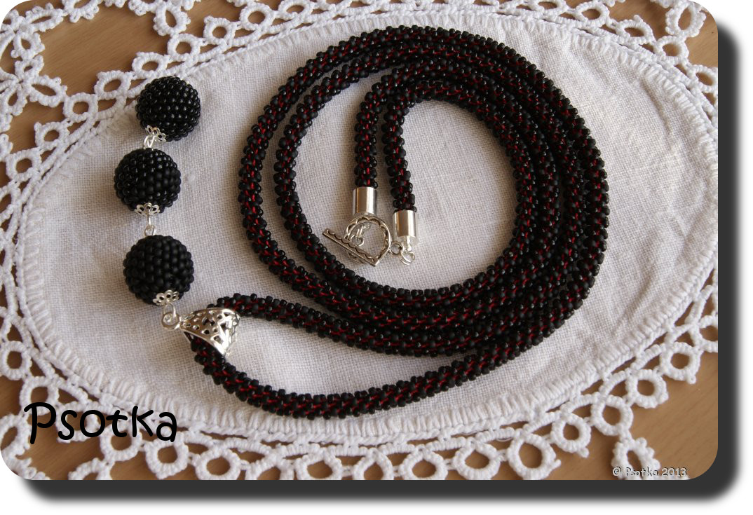 Do stworzenia poniższych sznurów wykorzystałam czerwony kordonek Altin Basak Klasik oraz koraliki TOHO Round 11o Opaque Jet i Frosted Jet. Nawlekłam je w sekwencji 1a1b.