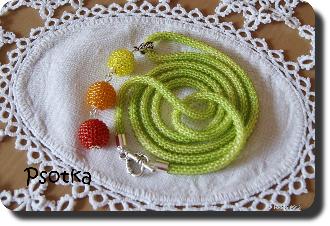 Sznur ma około 100 cm, a do jego wydziubania użyłam koraliki TOHO Round 11o Transparent Lime Green oraz jasnozielony cieniowany kordonek Kaja.