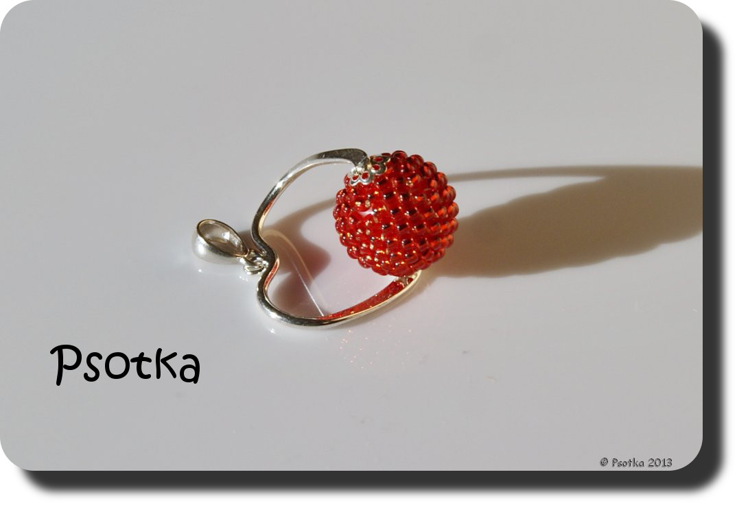 Pierwszy został wykonany z koralików TOHO Round 11o Silver-Lined Lt Siam Ruby. Kuleczki umieściłam w krawatkach o kształcie serc.