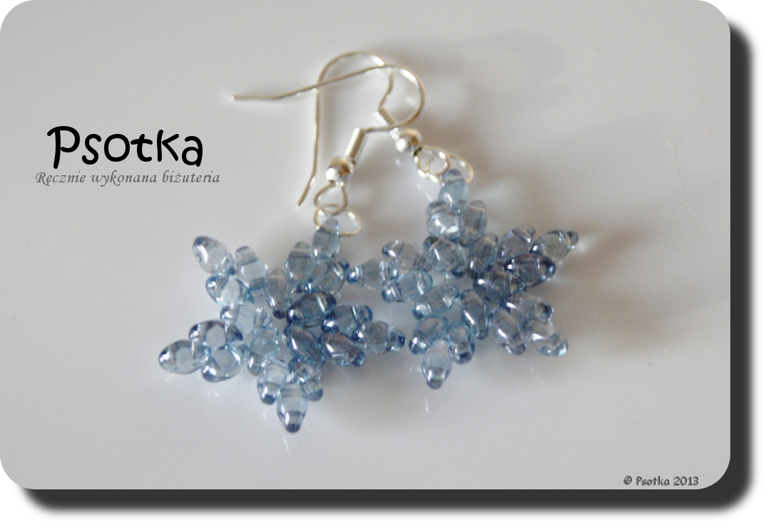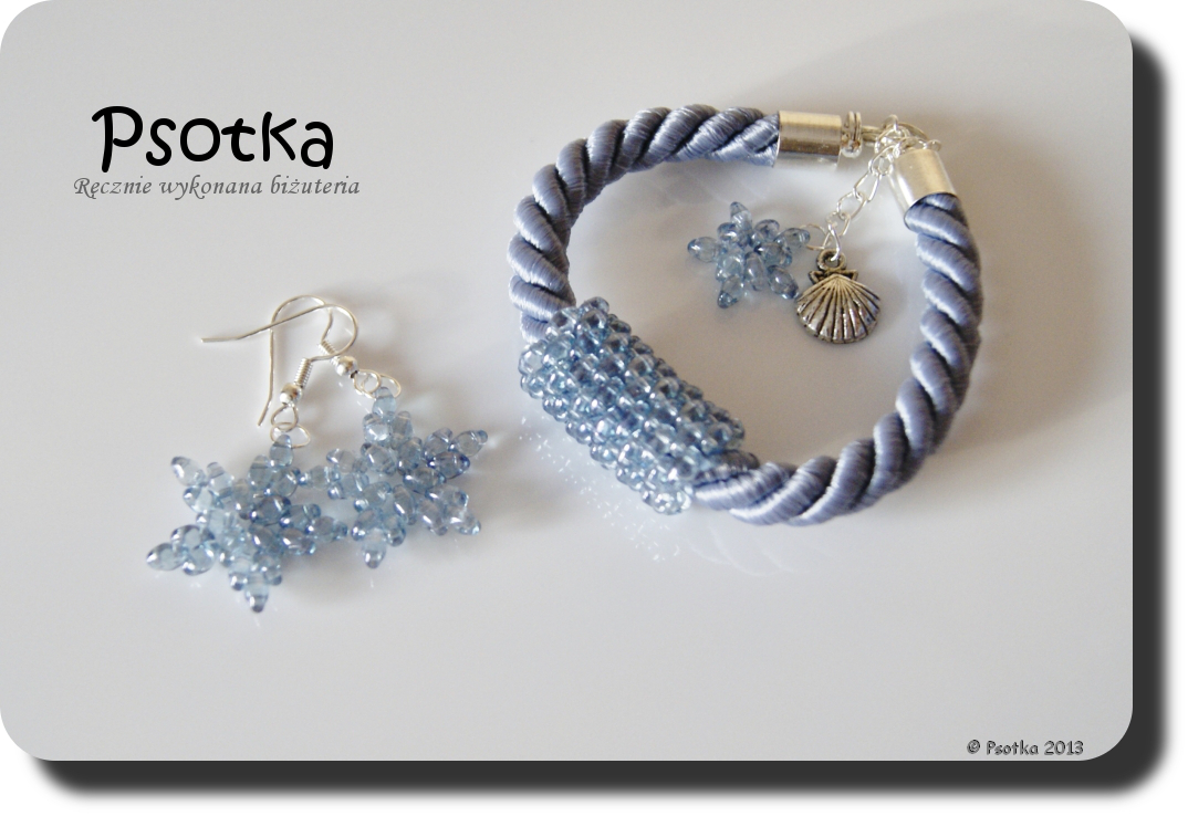 Poza tym z sznurka w kolorze brudno-niebieskim i SuperDuo Luster-Transparent Blue powstał komplet bransoletka i kolczyki gwiazdki.