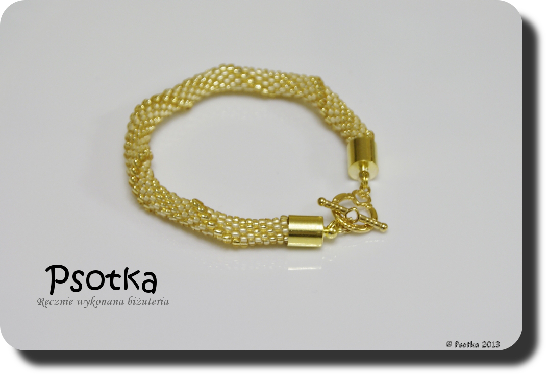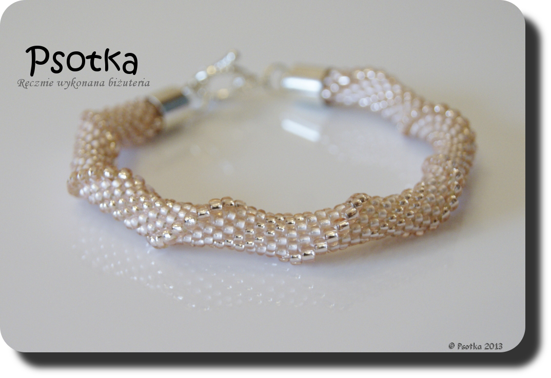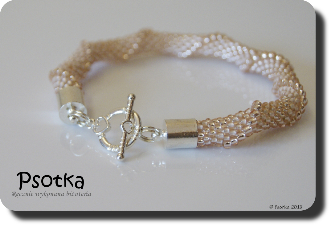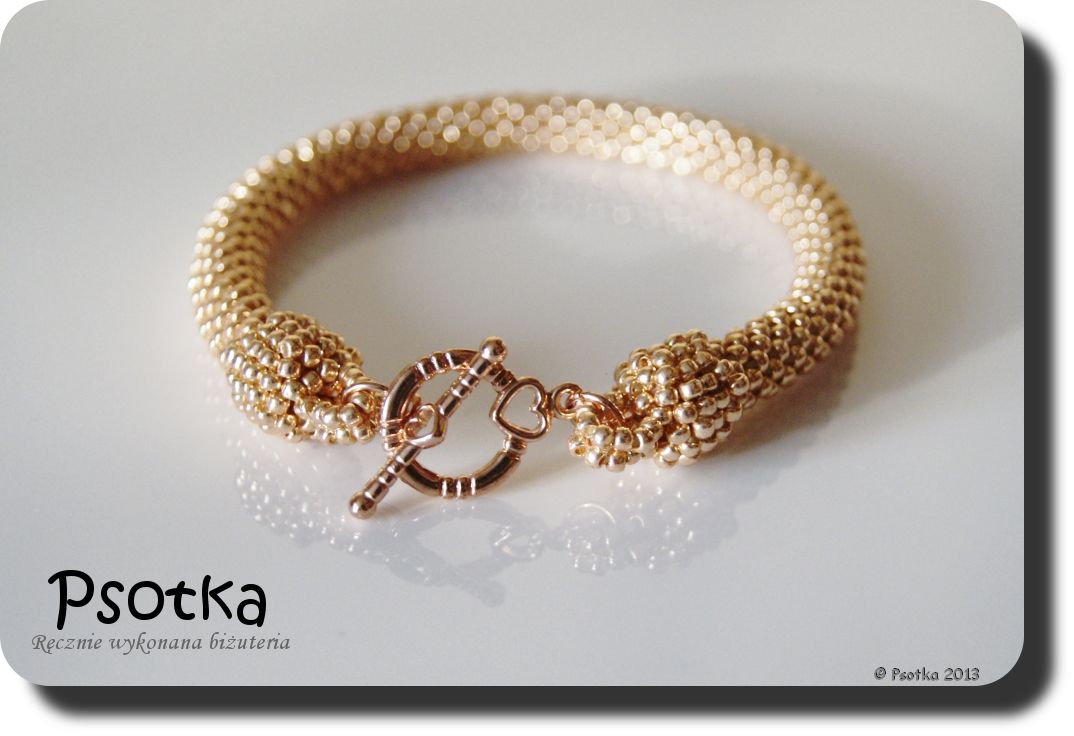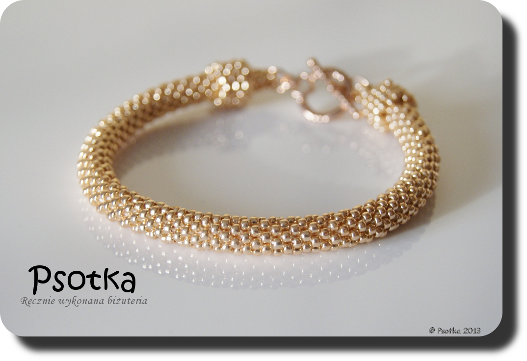 Pierwsza z bransoletek powstała w trakcie pobytu w sanatorium, ale na wykończenie i fotki musiała trochę poczekać. Wyszydełkowana jest ona na 6 koralików w rzędzie z TOHO Round 11o Permanent-Finish Galvanized Rose Gold oraz wykończona elementami w tym samym kolorze.