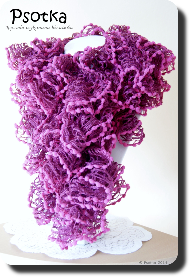 Pierwszy powstał z włóczki Alize Dantela w kolorze różu z amarantem (numer 447). Jego długość to około 130 cm.